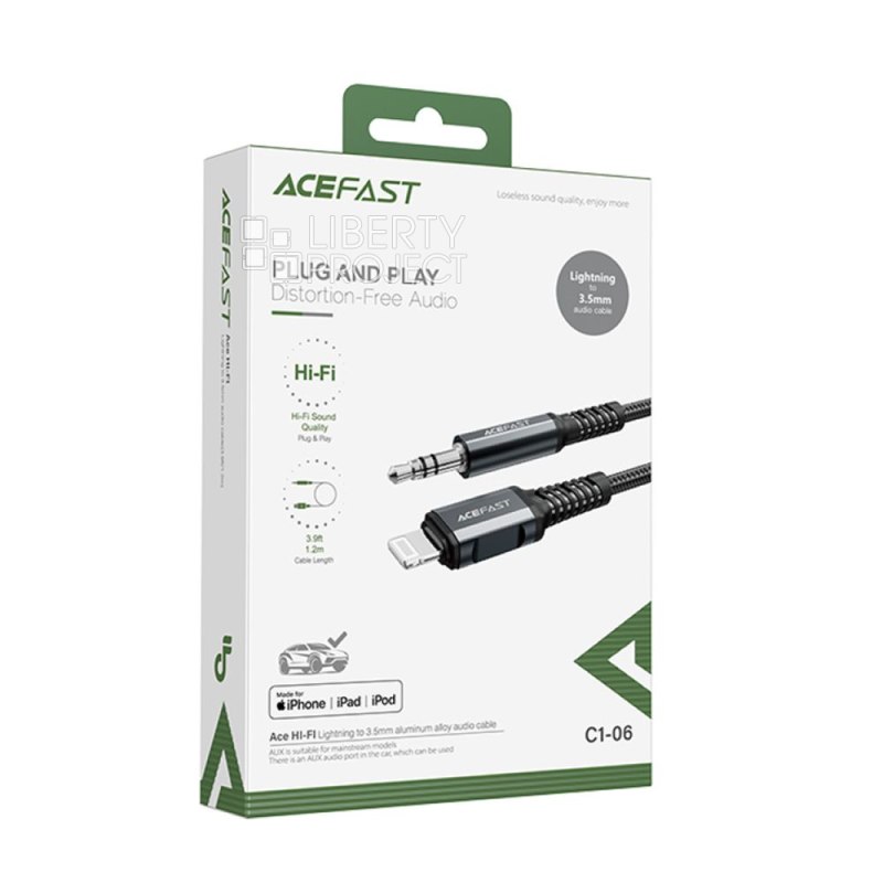 Особенности: Аудио кабель Lightning 8pin к jack 3,5mm. Провод core: 30AWG (10/0.08) * 3C OD: 3.5M. Цифровой чип. Поддержка Hi-Fi музыки без потерь. Длина 1,2 м. Вес: 36 г.