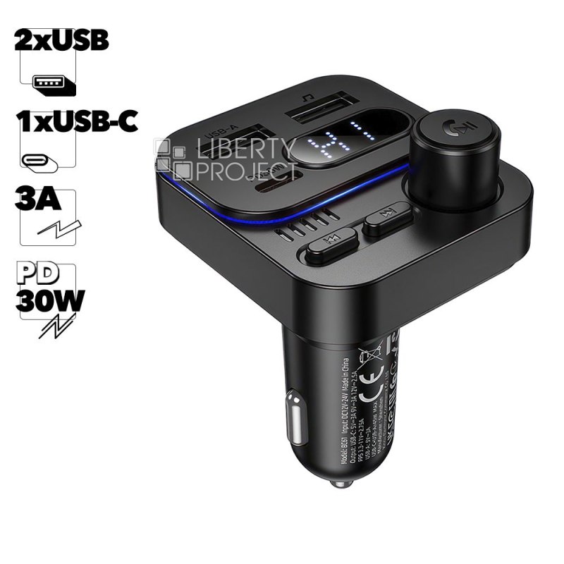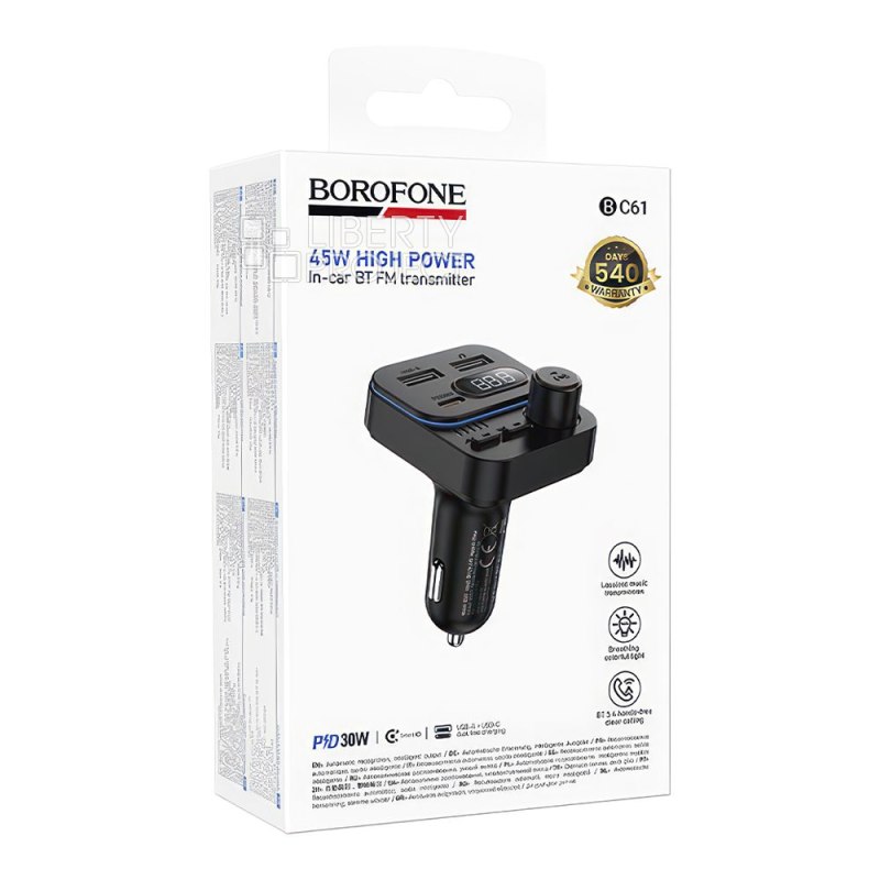Описание: Автомобильная зарядка BOROFONE BC61 практичное и прочное устройство для быстрой подзарядки смартфона во время поездок. Bluetooth 5.4. Выход: USB для музыки: 5В/0.5A; USB-A: 5В/3A; USB-C: 30Вт (PD/QC/FCP/AFC); USB-A+USB-C=45Вт. Поддерживает Bluetooth и USB-воспроизведение (до 32 ГБ).