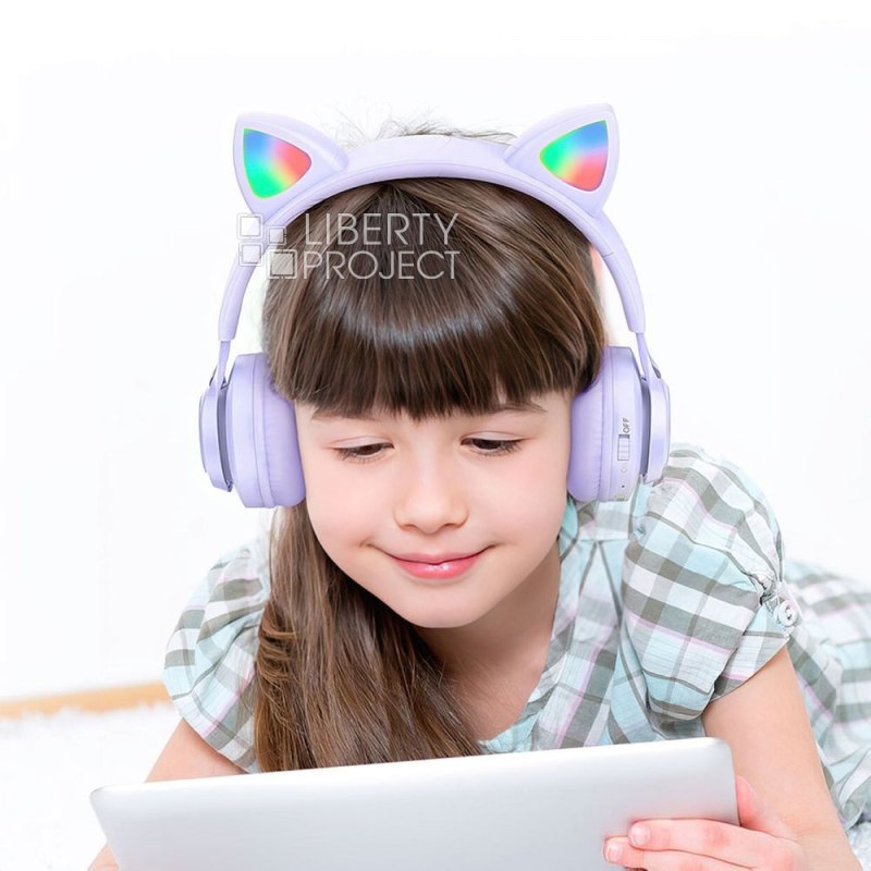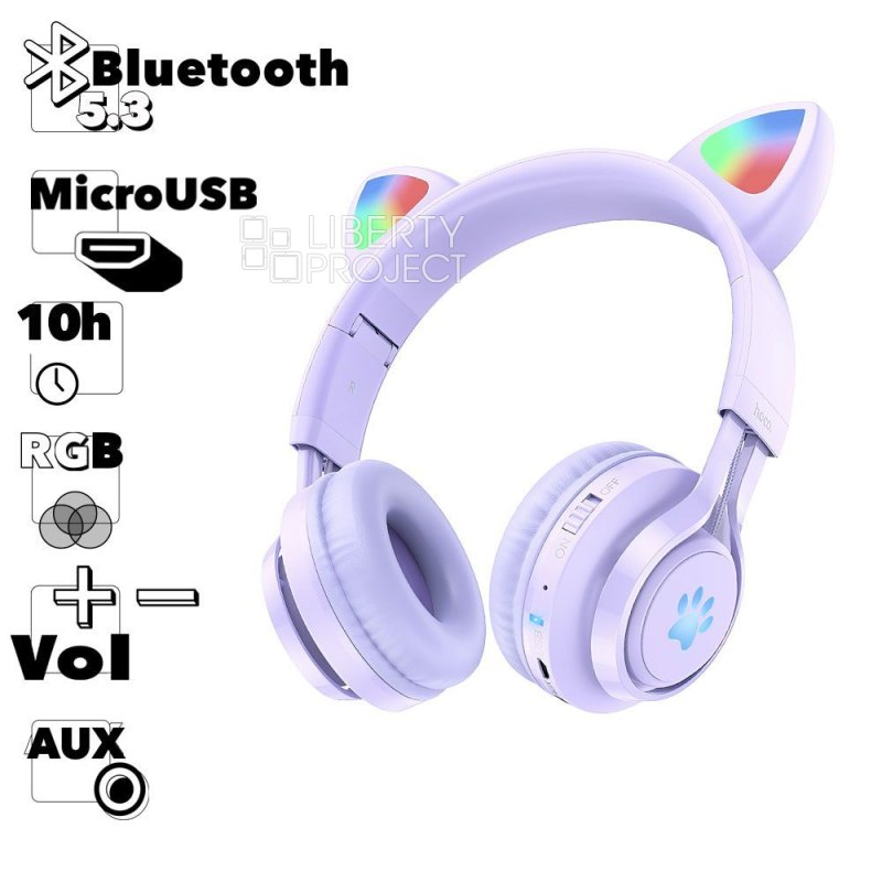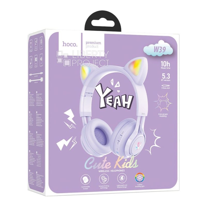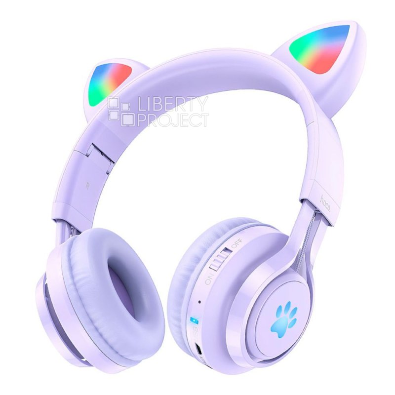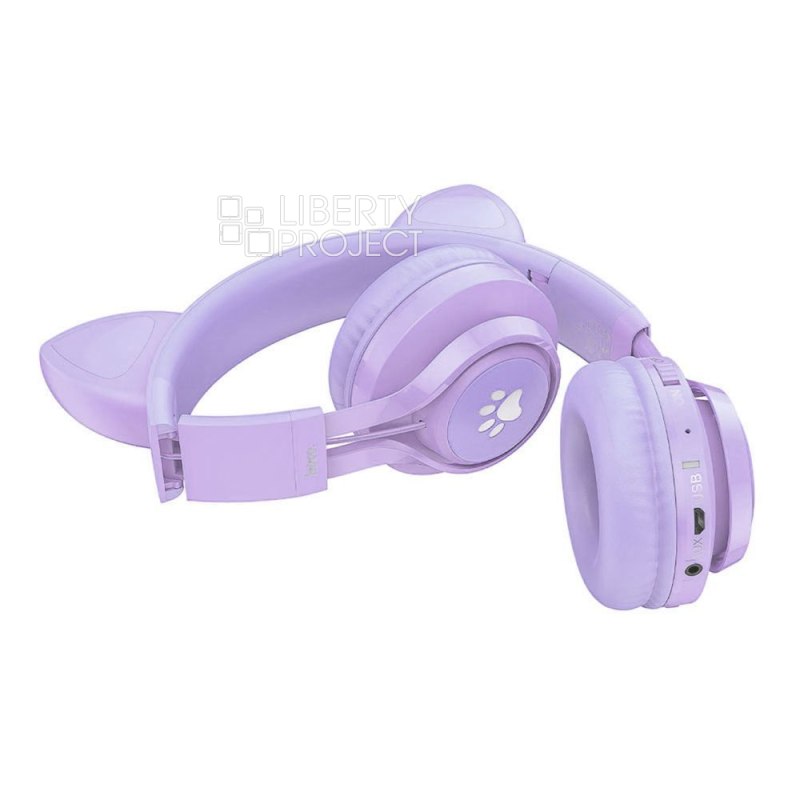 Bluetooth гарнитура HOCO W39 Cat Ear Kids BT 5.3, AUX, накладная, громкость +/-, LED, сиренев мятая