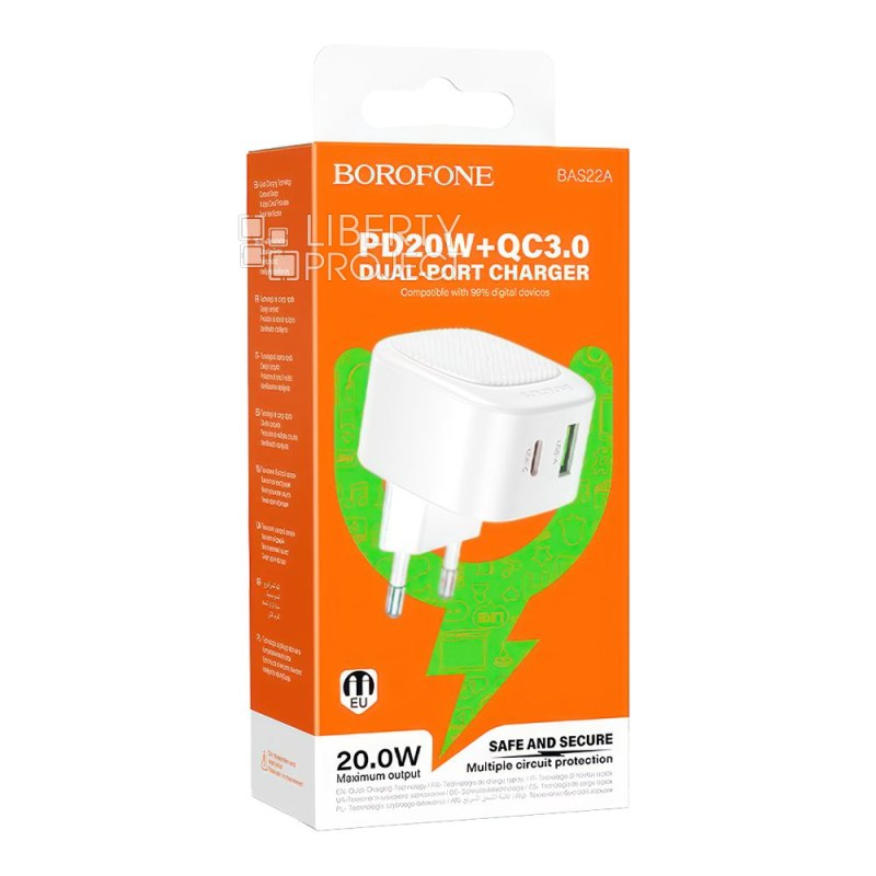 Описание: Сетевое зарядное устройство BOROFONE BAS22A Fortune компактное и универсальное решение для быстрой зарядки ваших гаджетов. Модель изготовлена из огнестойкого материала PC + ABS, обеспечивающего повышенную безопасность при эксплуатации. Устройство оснащено двумя выходными портами: USB‑C с поддержкой быстрой зарядки мощностью до 20 Вт (совместимо с технологиями PD, QC, FCP, AFC); USB‑A с выходной мощностью до 18 Вт. При одновременной зарядке через оба порта суммарный выходной ток составляет 5В/3А. Зарядное устройство оборудовано вилкой стандарта EU, что делает его удобным для использования в России и странах Евросоюза. Компактные габариты и небольшой вес позволяют легко брать устройство с собой в поездки и повседневные перемещения.