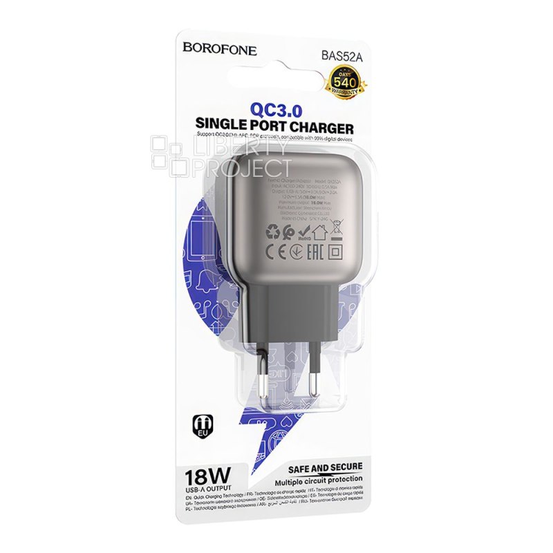 Описание: СЗУ BOROFONE BAS52A компактное и эффективное устройство, обеспечена быстрая и стабильная зарядка для смартфона и других портативных гаджетов. Материал: ABS. Выход: USB-A: 18 Вт (QC/FCP/AFC). Европейская вилка.