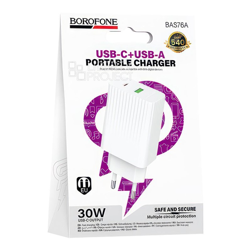 Описание: Зарядное устройство BOROFONE BAS76A сочетает в себе компактность, эффективность и быструю, стабильную зарядку смартфонов и портативных гаджетов. Материал: ABS-пластик. Выход: USB-C: 30 Вт (PD/QC/FCP/AFC). USB-A: 18 Вт (QC/FCP/AFC). USB-C+USB-A=5В/3А. Вилка EU.