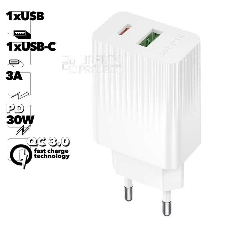 СЗУ BOROFONE BAS76A Source 1xUSB, 1xUSB-C, 3А, QC3.0, PD30W (белый)