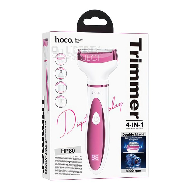 Описание: Триммер HOCO HP80 4 в 1 для женщин выполнен из ABS-пластика. Ёмкость аккумулятора составляет 300 мАч, время зарядки 2 часа, а время использования 80 минут. Устройство не является водонепроницаемым. Скорость мотора достигает 8900 оборотов в минуту. Триммер оснащён LED-дисплеем, который показывает уровень заряда батареи и напоминает о необходимости зарядки. В комплекте идут насадки: бритва, вращающийся нож, зарядный кабель и щётка для чистки.