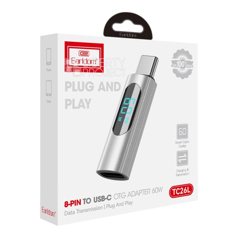 Описание: Адаптер Earldom ET-TC26L небольшое устройство с высокой скоростью передачи данных и простой установкой, удобный для ежедневного использования. Материал корпуса: алюминиевый сплав. Интерфейс: USB-L (гнездо) на USB-C (штекер). Поддерживаемые протоколы: Адаптер Apple на Type-C для кабеля C/L поддерживает быструю зарядку 60W PD с передачей данных; Адаптер Apple на Type-C для кабеля A/L поддерживает зарядку 5В / 2.4А. Функции: цифровой дисплей напряжения и данных зарядки.